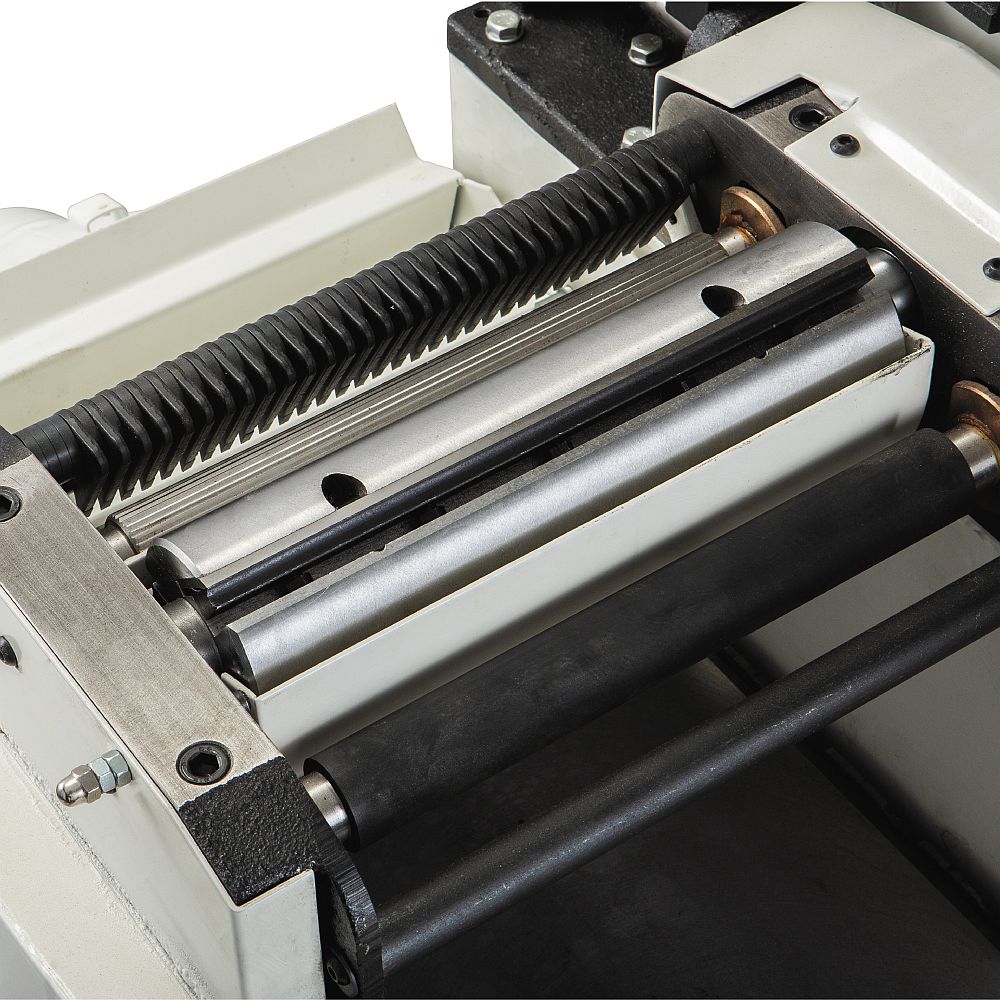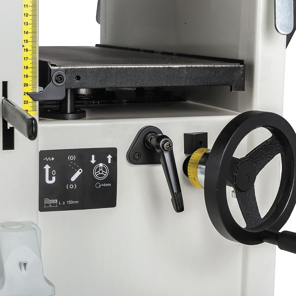 Du kan løfte støpejernsbordet komfortabelt med bare én hånd. Bytteoperasjoner kunne ikke vært enklere. Det lange bordet med presis føring sikrer utmerket nøyaktighet og fin finish takket være skjæremekanismen med tre kniver. Enkel høydejustering av innmatingsbordet takket være en spak med kambetjening. Støvutløpet holder arbeidet rent etter at det er koblet til en egnet støvoppsamler.