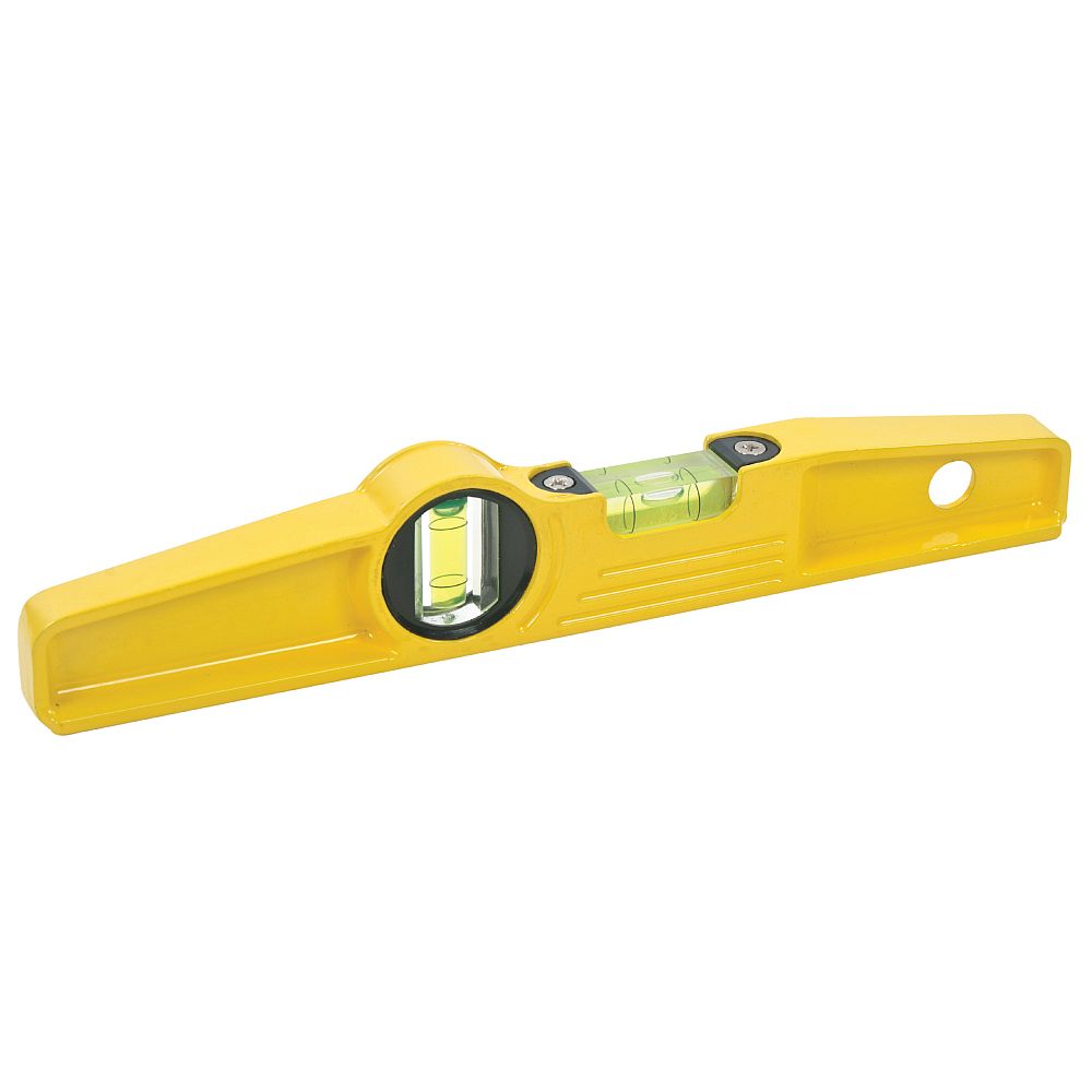Vaterpass med en fast og stiv aluminiumskonstruksjon med to libeller for vertikal og horisontal måling.