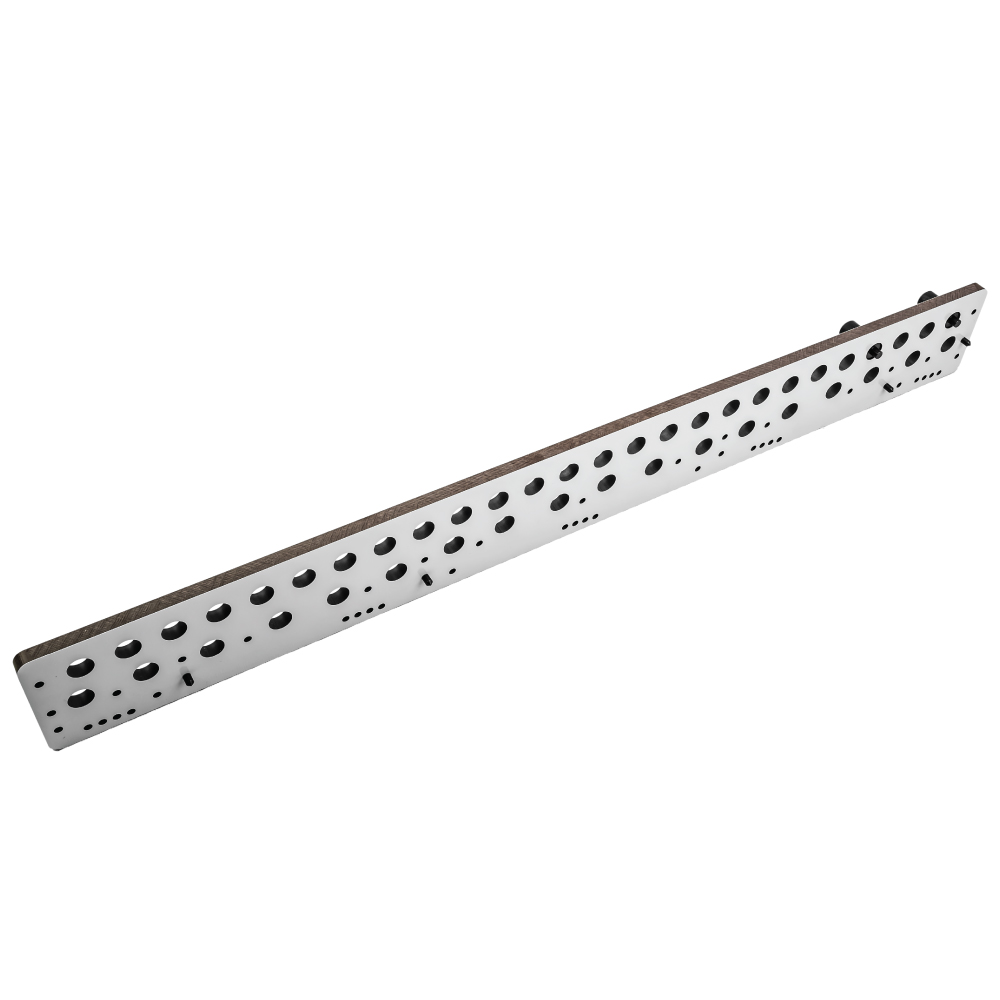 For boring av hyllestøtter bruker du hovedlinjen med hull med 32 mm deling. Anslagene hjelper deg med å få en nøyaktig vinkel på malen og plasserer malen i ønsket avstand fra kanten. Bor ut hullene i 3 mm eller 5 mm, avhengig av hvilken type du bruker. Det er en stor fordel at du kan bore flere hull samtidig. Jiggen er et ideelt verktøy for arbeid på stedet eller i et snekkerverksted.