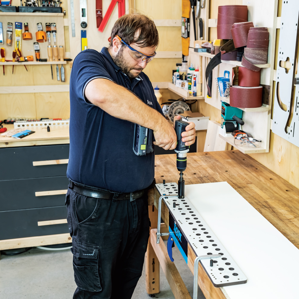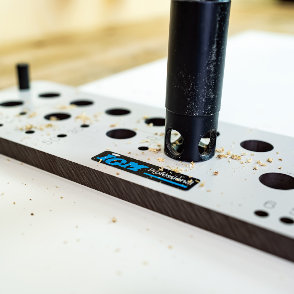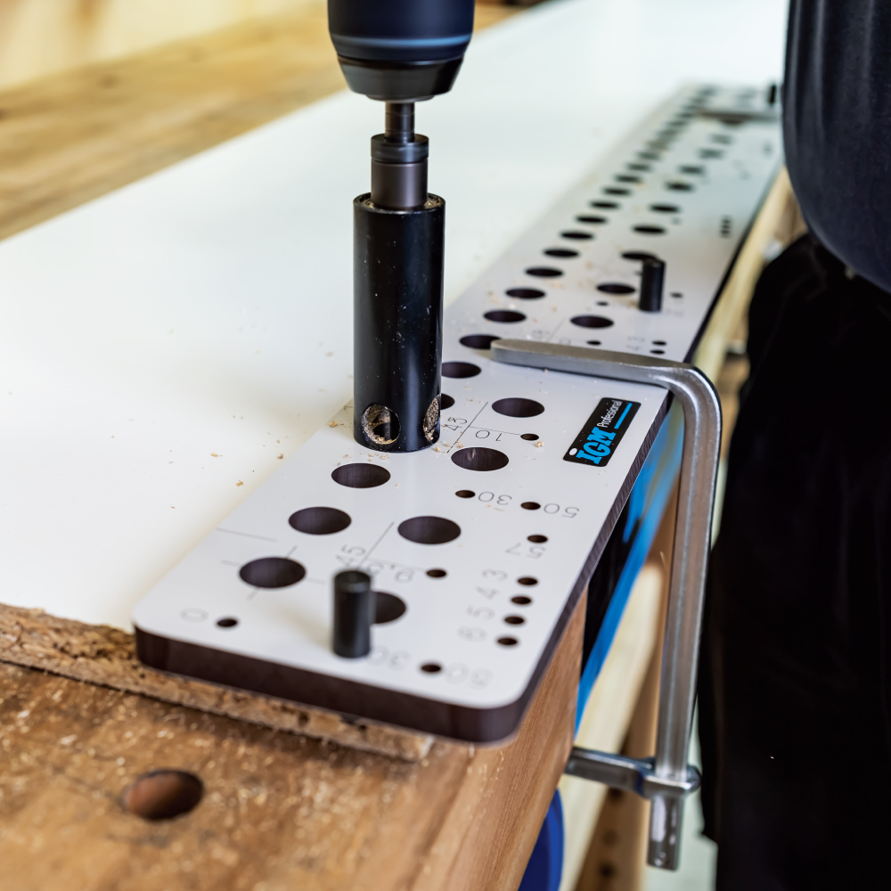 Det går veldig raskt å arbeide med malen. Du stiller ganske enkelt inn boredybden på borespindelen og monterer den på boret. Du legger malen på bordet, hviler den på anslagene og strammer klemmene eller holder den godt fast med den frie hånden. Takket være dyvelboret med styrespiss og rissing kan du bore hull enkelt, nøyaktig og uten grader på kanten av hullet. Det er enkelt og veldig raskt.