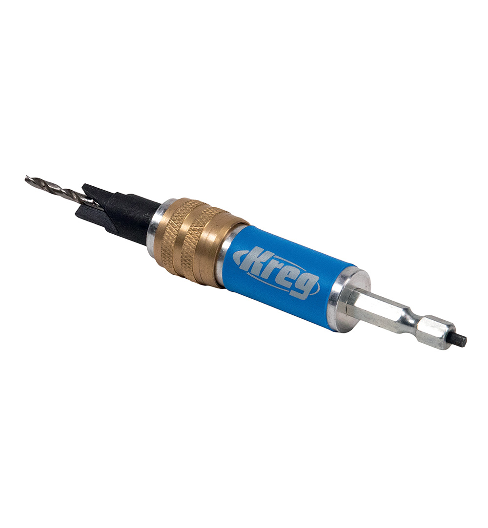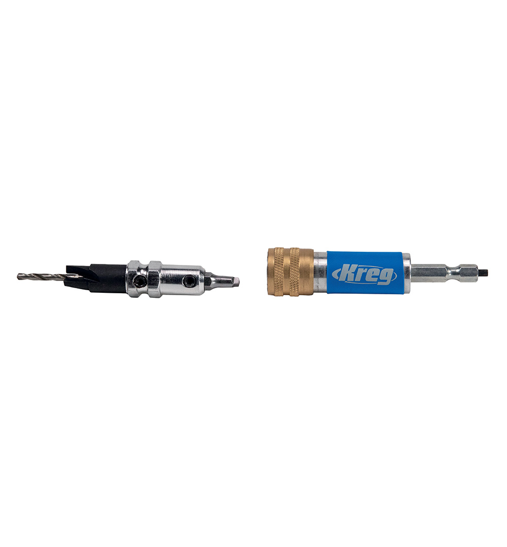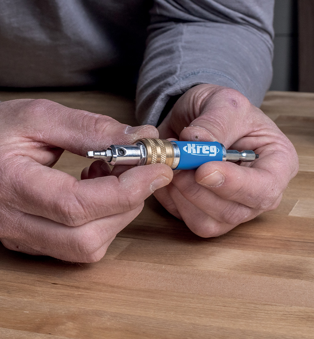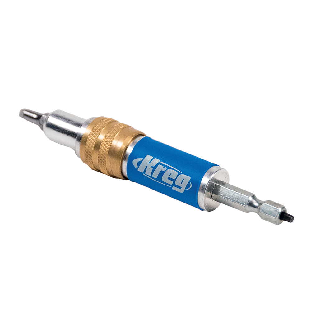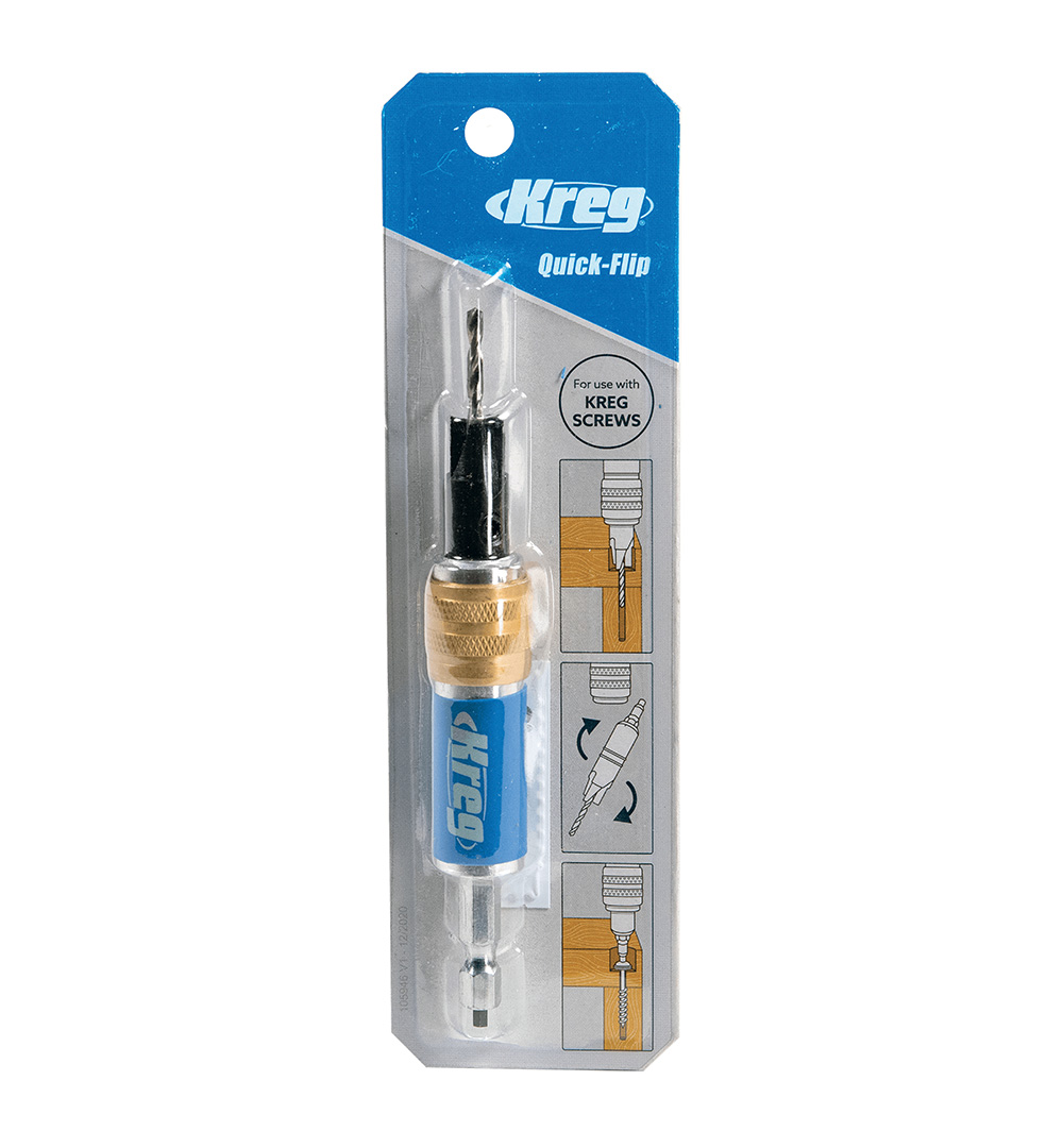 Quick-Flip har en innsats med to ender i et hurtigutløsende hus. I den ene enden er det et bor som er dimensjonert for å bore et perfekt pilothull for en Kreg-skrue, pluss en kutter som borer en flatbunnet senkning som skruehodet passer inn i. Snu deretter innsatsen rundt for å eksponere den andre enden: en #2 firkantbits som er spesialdesignet for bruk med Kreg-skruer.