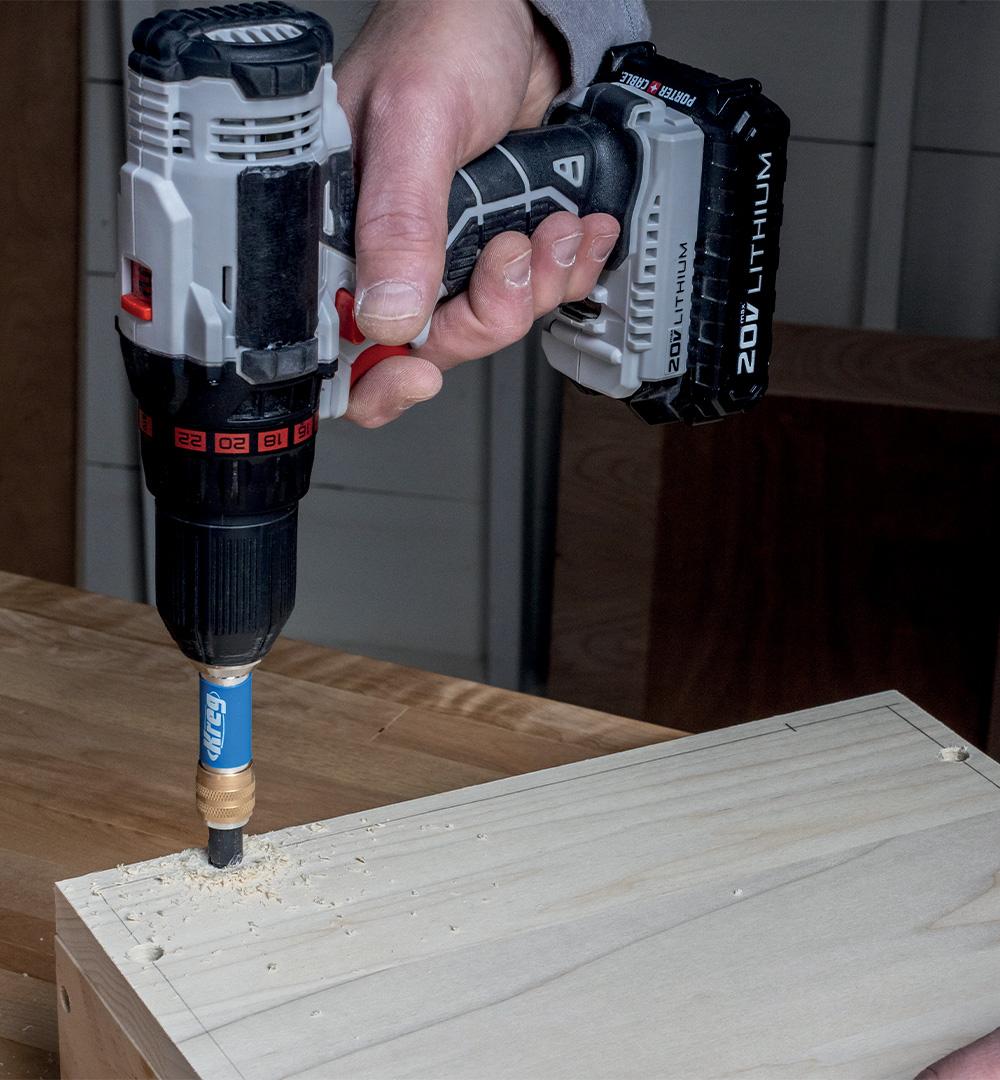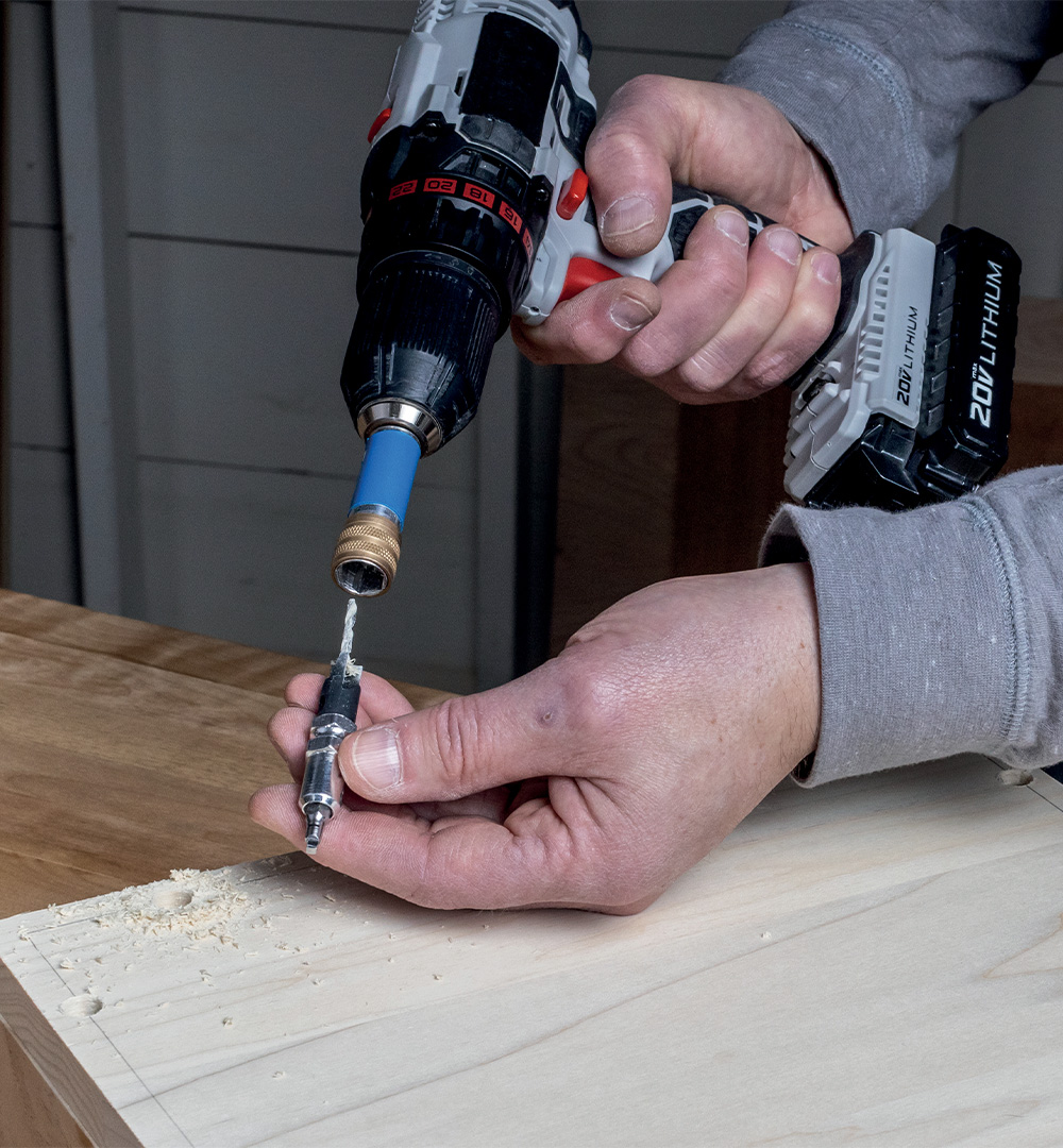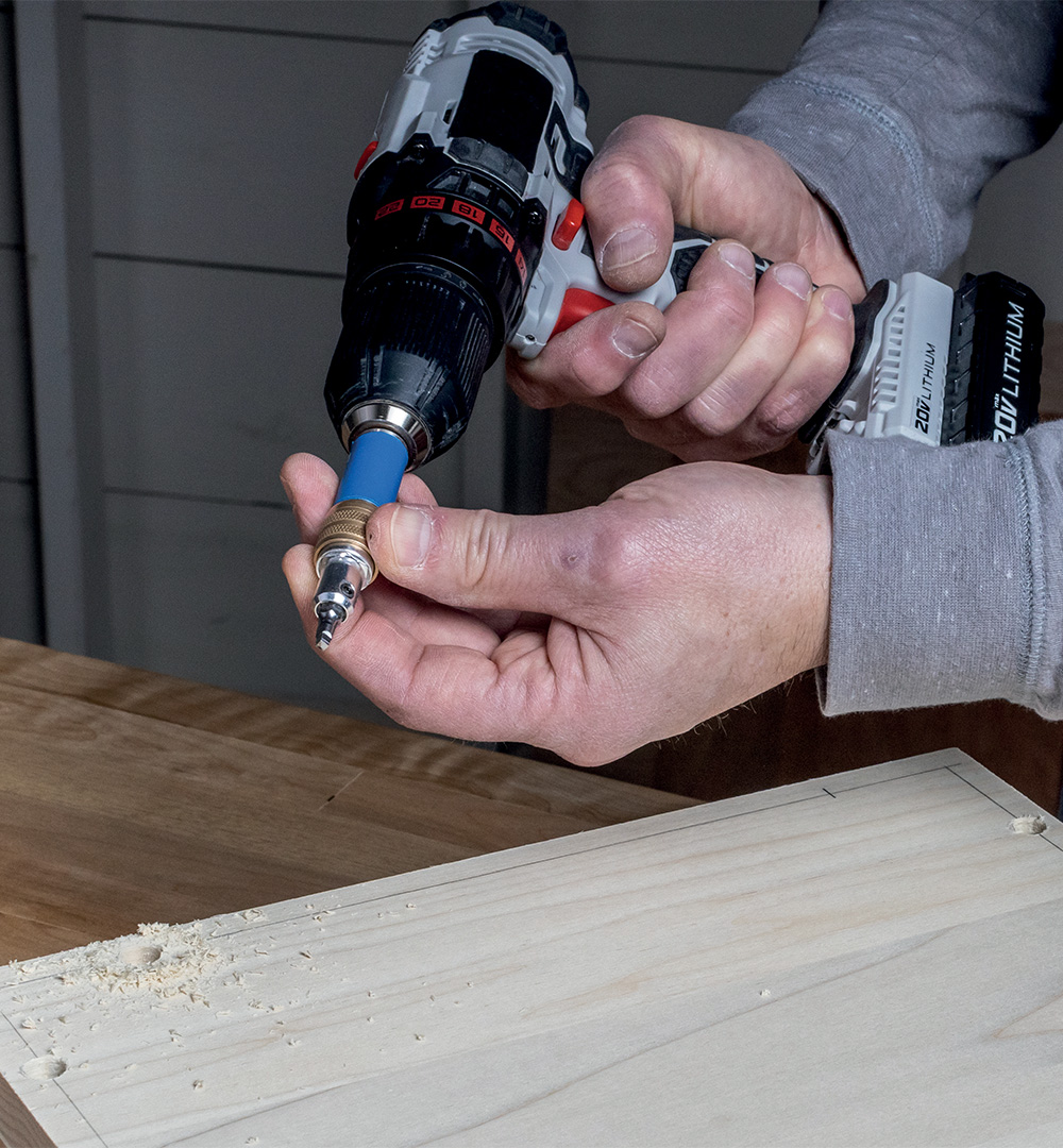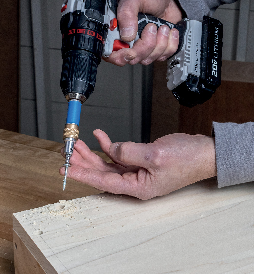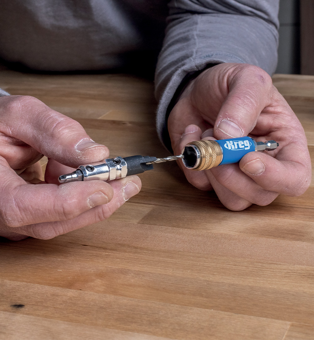Quick-Flip har en innsats med to ender i et hurtigutløsende hus. I den ene enden er det et bor som er dimensjonert for å bore et perfekt pilothull for en Kreg-skrue, pluss en kutter som borer en flatbunnet senkning som skruehodet passer inn i. Snu deretter innsatsen rundt for å eksponere den andre enden: en #2 firkantbits som er spesialdesignet for bruk med Kreg-skruer.