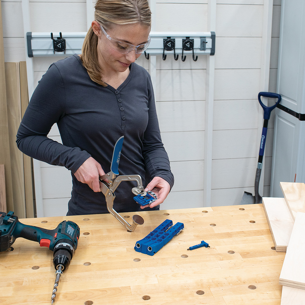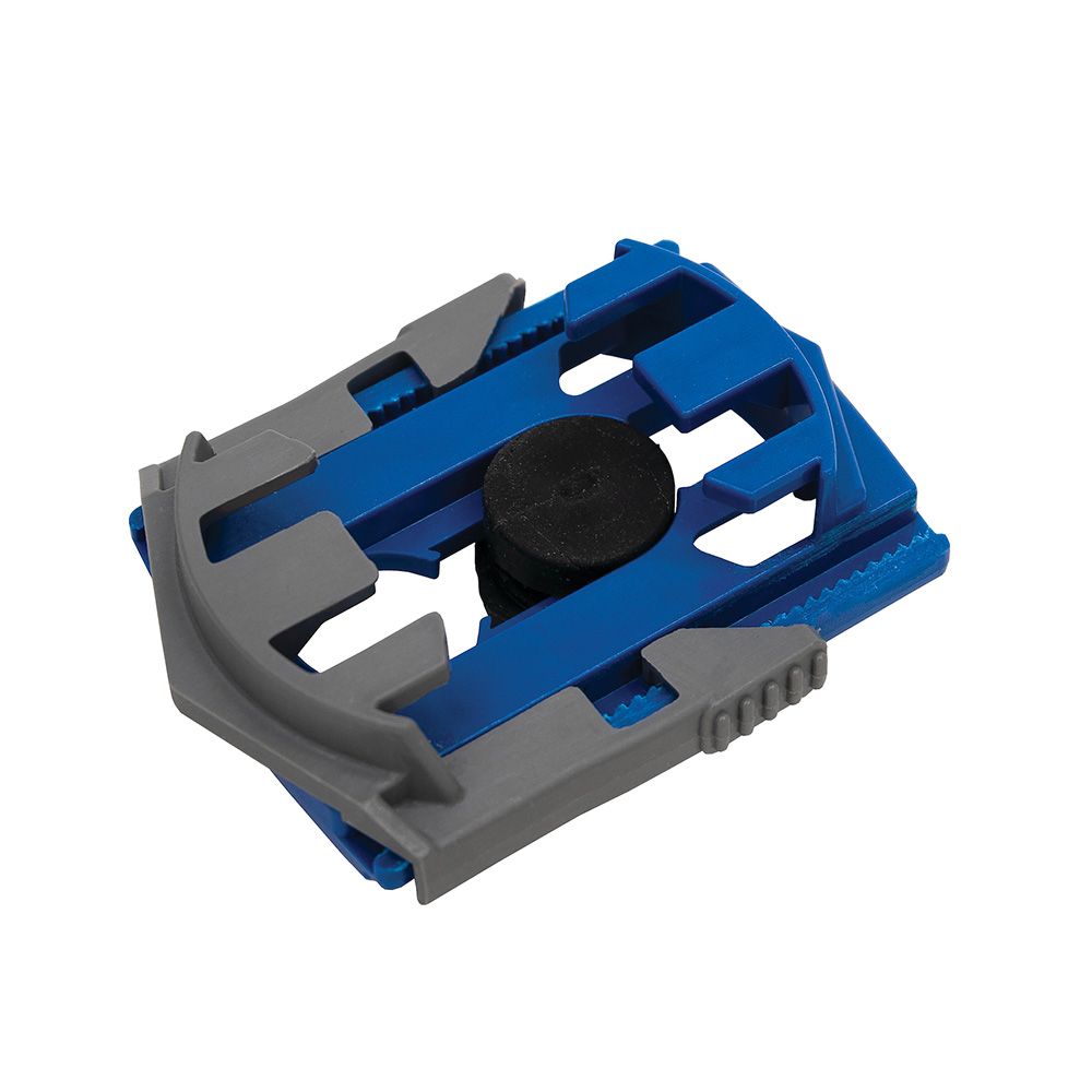 Gjør det enda enklere å holde Kreg 300 Series Pocket-Hole Jig på plass mens du arbeider ved hjelp av den universelle klemmeadapteren. Universal Clamp Adapter passer inn i boreguiden og kan brukes med alle Kreg Clamps, samt de fleste utløserklemmer. Adapteren låses fast på klemmen, slik at jiggen holdes sikkert på plass, og du kan flytte og plassere jiggen med bare én hånd.