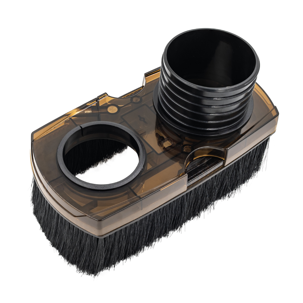 Skoen, som kobles til en 100 mm avtrekksslange, bidrar til effektiv oppsamling av støv under drift etter tilkobling til en støvoppsamler. Dekselet er utstyrt med børster og magneter, slik at det er enkelt å fjerne og få tilgang til spindelen.